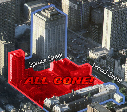 In this picture which I have doctored the red area indicates a large section of the city that is no more. Anderson Hall at Broad and Spruce that held the classrooms has reverted to an office building. The school still owns the building at Broad and Pine, but the spot next to it, Arco Park, the stores, apartment building, The Swamp (where the cool kids lived), The Bellrich Hotel, Corson’s Pharmacy – all gone!
