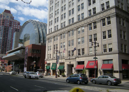 Here’s another view looking South on Broad Street. The building on the right is where PCA held the majority of its classes. It is once again an office building with dueling steak houses on the ground floor, strangely enough. The windows with the green awnings is one steakhouse and the windows with the red awnings is an entirely different steakhouse. They were once an art supply store and the school’s gallery. Now they sell meat and more meat. Weird.