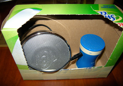 I put the playlist on a Sansa Shaker, my favorite MP3 player, and attached it to a battery powered speaker for a little more oomph. These were placed in a box and hot glued to the inside of the bottom of the costume. Presto! Working jukebox! You can see some finished photos of the costume here or take a look at this brief video of the suit in action: