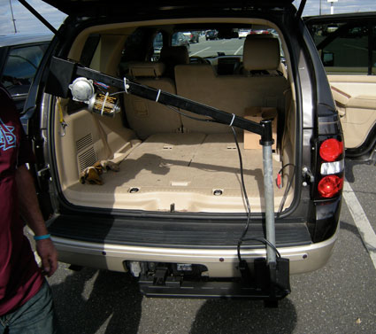 Charles realized that wrestling the Worm-Mobile in and out of a car or truck was not going to be an easy task so he put together an electric winch to easily get the mechanical bar stool in and out of Brian’s vehicle.