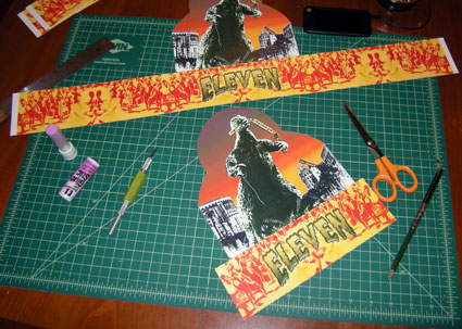 What Lloyd is into is the Godzilla movies especially the ones that came out of Japan after the ill-conceived American remake in the late ’90s. Tina went to work. She went back to the original movie and scanned some pictures from The Pictorial History of Horror Movies. She colorized the pictures and assembled it all in Photoshop .