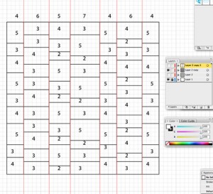 With a new member of the family arriving in May, I decided to welcome her with a quilt. I worked out a pattern in Illustrator of rectangular rows varying in widths and heights. I chose five fabrics, three of which were from Denyse Schmidt’s Hope Valley collection. I scanned the fabrics into Photoshop and began to drop the patterns into my grid as a visual aid to myself. Once the design decisions were made, I cut the squares and sewed them together.