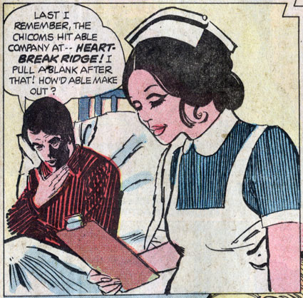 Check out this weirdly stylized nurse below. It looks like she was cribbed from a pantyhose or feminine hygiene ad from that time. She smiles serenely as this guy recollects the horrors of his battlefield experiences.
