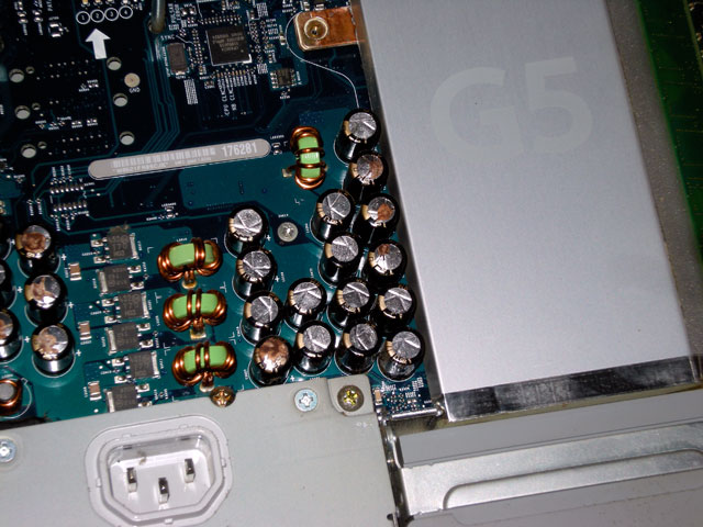 I had encountered this capacitor issue before when Dan Love and I started looking at a mutual friend’s 20″ iMac that was having video problems. That Mac looked a lot better than the Mac above, but there was some of the telltale swelling on a couple of the capacitors. The owner opted to have the logic board sent out to a repair service that would replace the bad caps. Sadly, it didn’t work out. Once the board was returned and replaced in the machine, it worked fine for a while, but than started to behave erratically and have kernel panics left and right. The owner gave up in disgust. Neither I nor Dan could really invest the time to possibly get it running again. The particular capacitor service promised to replace the capacitors and that’s what they did, but they mainly deal with PCs and openly admit that they are not equipped to test out Macs. If there is a Apple-centic service that replaces capacitors, I’d really like to know.