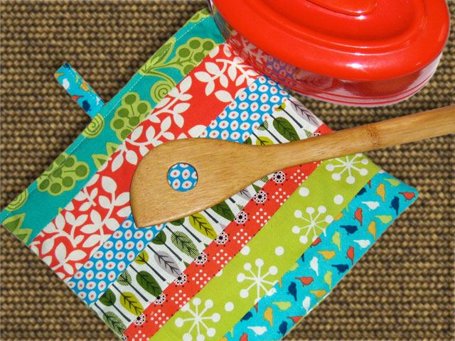 Rooting around in my studio, I found a pile of long strips of beloved, but no longer available fabrics in my stash. I arranged and rearranged them, and sewed them together. Then I sandwiched a piece of leftover quilt batting in between the front and back, and stitched them up. Voila! In less than twenty minutes, a new hot pad for the dining room table!
