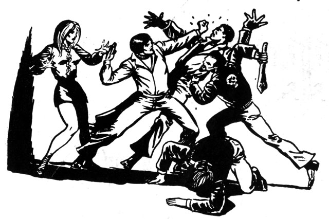 I like this illustration which is only a small portion of the full page ad. It looks like a real comic pro did it. The gal in the mini–dress looked like she was copied from John Romita work. She could be Gwen Stacy’s sister. The guy with the club and the skull jacket sort of looks like a John Byrne drawing. It’s a guess on my part.