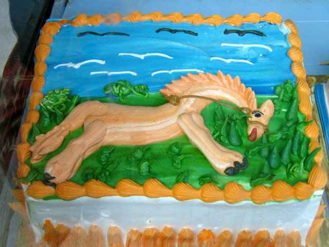 As much as I would hate to beat a dead horse, our friend Flicka in the photo above, looks as dead as Britney Spear’s career. I’m sure that the artiste with the bag of butter cream meant to portray this horse as gaily galloping through a field. It ain’t working on me. It looks dead. It looks as if that protruding tongue has licked its last sugar cube and the buzzards are coming home to roost.Just my double pennies, no kid wants an Equus themed cake.