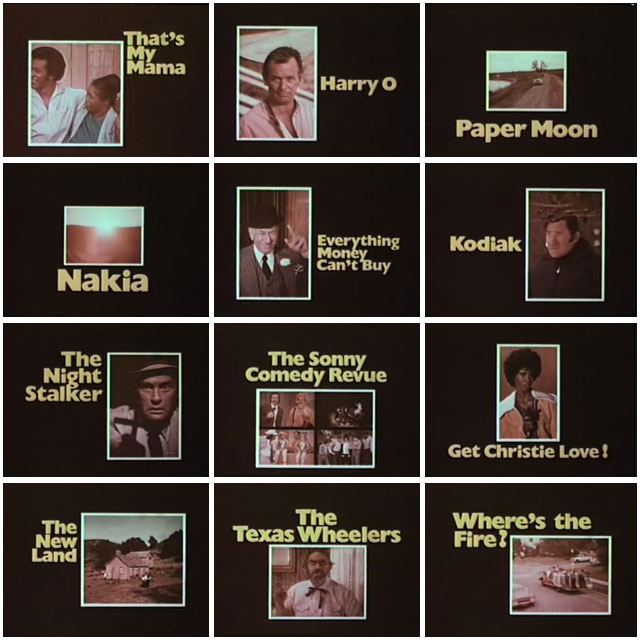 Having watched that, I’m not sure how I made it through 1974 to 1975. From the looks of it, ABC scarcely made it through themselves. Notice that the people in the beginning of this promo are doing everything and any thing other than watching TV. With a lineup like this, there were ample reasons. If all I had to look forward to was a Cher-less Sonny in The Sonny Comedy Revue, I would have taken up basket weaving or macrame or possibly studied harder. Fortunately there were two other competing networks at the time.