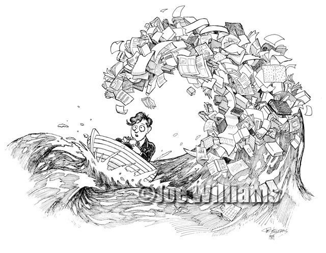 This was an illustration I did for The Jewish Exponent back in the 80s. It was for an article on the incredible surge in the amount of printed information. It went on to detail the trials and tribulations of researchers who have to slog through the ever-growing pile of printed works.