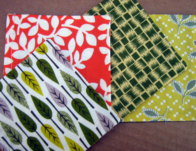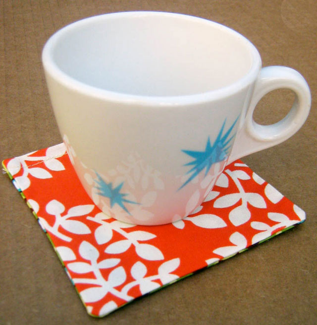 Ever since America Online stopped stuffing my mailbox with their trial CDs, I really needed coasters! I’m not fond of the brown ring on my desk from my coffee cup, or the puddle left behind by my afternoon chilled beverages. Instead of using bland napkins from the supermarket, why not have something stylish and reusable? These coasters measure four inches square, are reversible, and can be stitched up in a matter of minutes!