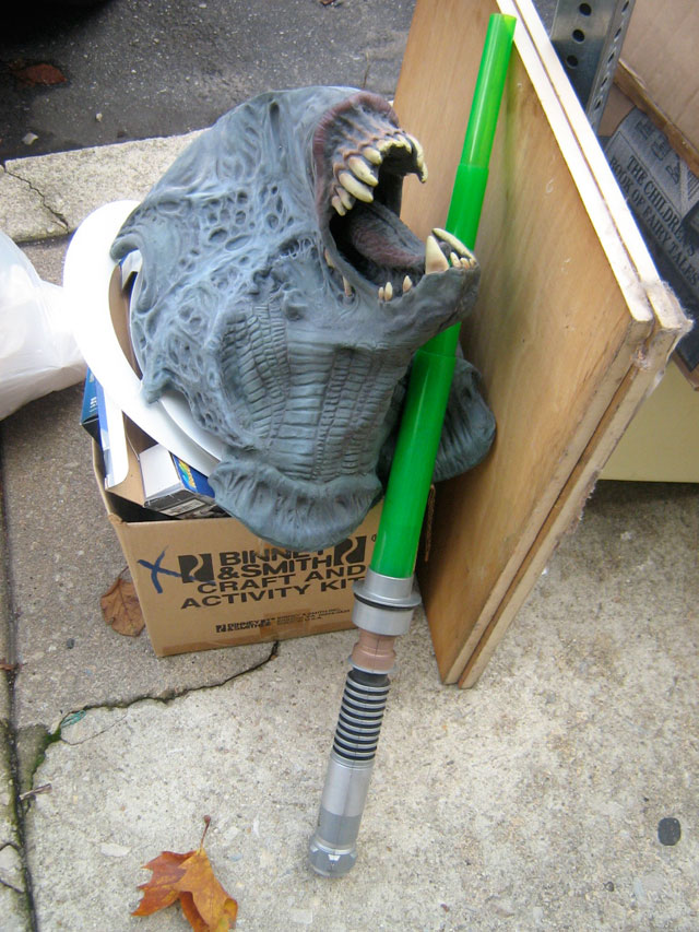 Here’s what looks like a fairly nifty Alien mask and a light saber on 11th Street in South Philadelphia. What gives? Philistines!