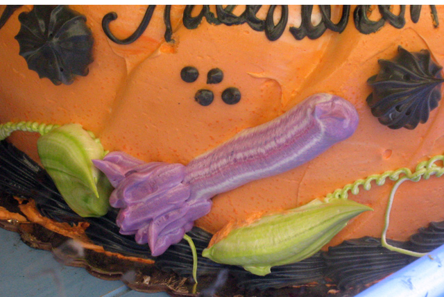 This spider topped beauty is giving me a case of Halloween-orexia! It has all of the necessary components of horror – a jack-o-lantern face, a dismembered arachnid, and lots of fang rotting, wax lip licking sweet orange icing. Just one question – what exactly is this striped purple thing?