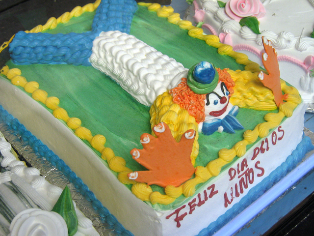 I think what the clown is doing is this: He is holding all 4 corners of the cake in place. If he were to get up from that position I am certain the 4 corners would retreat back to the middle area of the cake. Maybe it is really a round cake and he is stretching it into a rectangle? That bakery is heavy on the icing, that is for sure! Thanks for sharing this one!