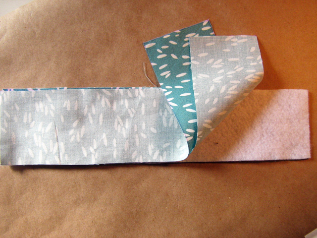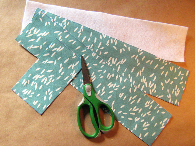 1. Cut out 2 pieces of fabric 2 1/2″ x 11″, one piece of white felt 2 1/2″ x 11, and one piece of fabric 2 1/2″ x 4″.