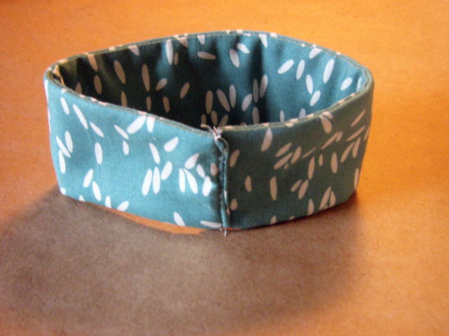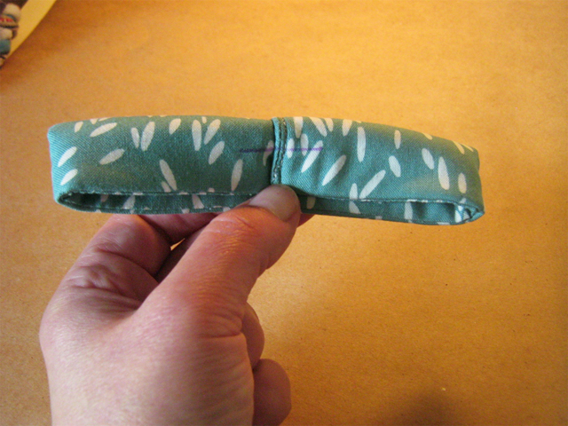 5. Tuck in the ends of the 2.5″ x 11″ strip and sew. Join the ends and sew together by hand or machine, so it looks like a fabric bracelet.