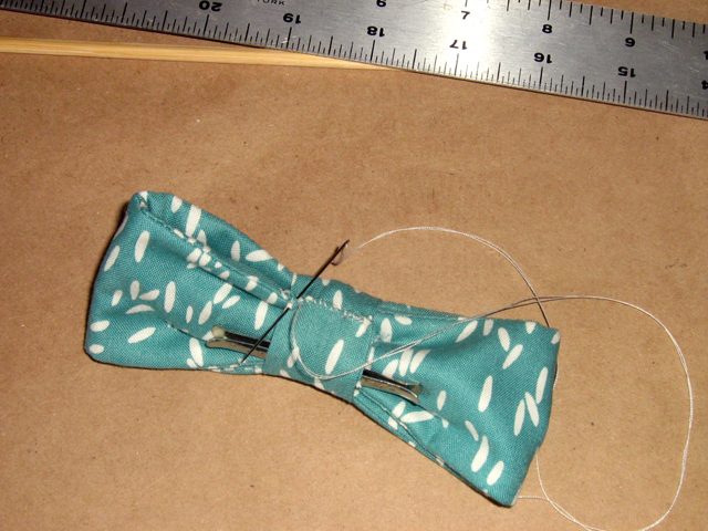 9. Fold the top and bottom of the bow tie toward the back, take the 2 1/2″ x 4″ piece of fabric and wrap it tightly around the center and hand stitch. This will also hide the cuts and keep the clip in place.
