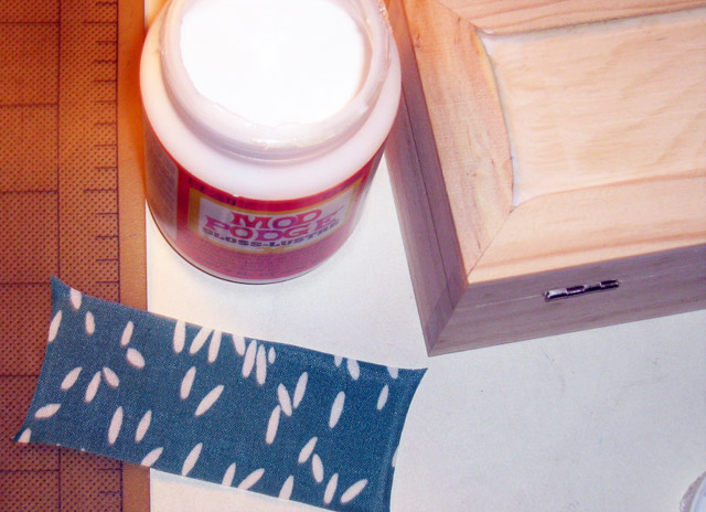 Rather than go with a typical gift-wrapped cardboard box for this bow tie I made, I decided to go with a neat little wooden box that I found at an AC Moore. I liked the cutout on the top of the box and wanted to use the fabric I made the bow tie with in that space. I brushed some Mod Podge on a piece of the fabric so when I cut it out it wouldn’t fray. I put the box on my scanner lid side down, scanned it at 100% and printed it out for a guide. I taped the fabric to the guide and cut it out. After I glued the fabric into place, I coated the box with two coats of varnish.