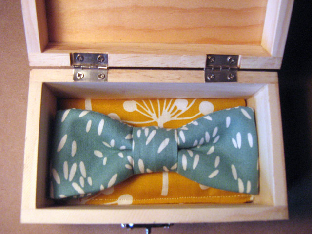 I used a piece of Lotta Jansdotter’s Spring Buds in mustard to make a small cushion for the bottom of the box. Voila! A special box for a special bow tie!