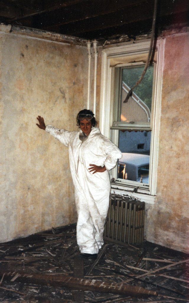 owhome that was built in 1910. It’s a good house in a nice neighborhood, however there was an unfortunate drop ceiling in the living room/dining room. “No problem”, we thought, “we’ll just get rid of it and patch and paint the original ceiling!” Long story short – what was left of the original ceiling was unsalvageable and the ceiling had to come down. It took a few hours with a couple of crowbars to pull it down, and several days to clean up the plaster and lath. It was hot and humid, and we wore these hideous hooded jumpsuits to protect our clothes and skin that made matters worse. I have never been so dirty in all my life.