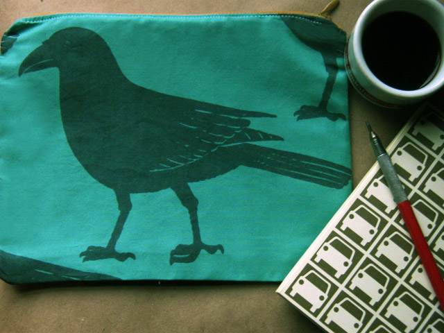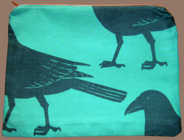 It wasn’t until she said, “I thought you could do something with it” that got the wheels spinning. I thought it would make a nice zippered pouch. This one measures 8 1/2″ x 6 1/2″, is big enough for a small notebook and a pen, and is lined with Lotta Jansdotter’s Spring Buds in mustard. The front of the pouch is a portrait of the crow, while the back features bird parts.