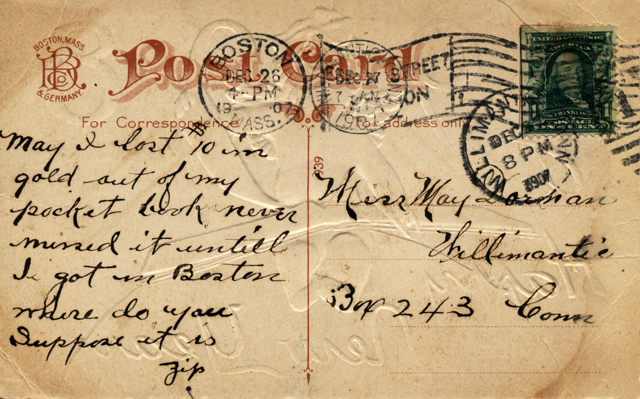 This is a postcard I’ve had for a while, sent from Boston to Willimantic, CT. I wonder if Zip ever got that money back.