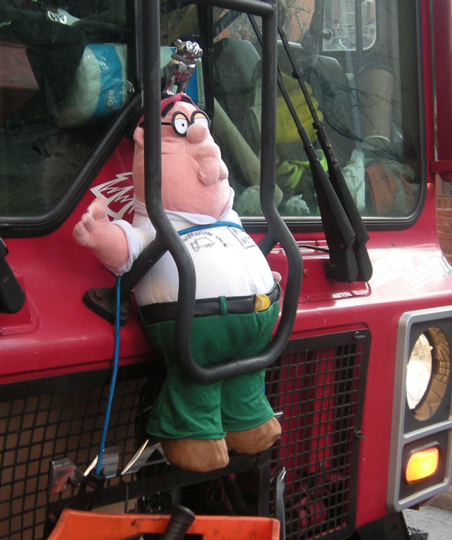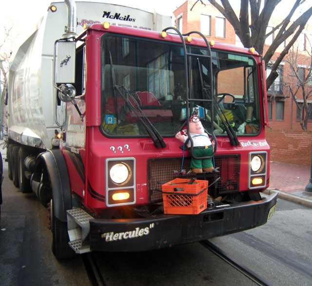 I spotted this Truck Mascot on 12th Street in what is known as Center City in Philadelphia. It’s a Peter Griffin doll from Family Guy, and he looks relatively new to wind up as the mascot on a commercial trash truck.