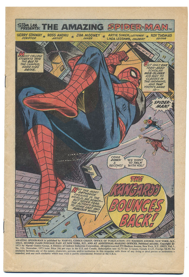 The other thing that excited me was Ross Andru’s art. It was so much more dynamic than the images in the cartoon. The animators of that series had a horrendous habit of reusing sequences of the cartoon over and over again. Some times the show was padded out with library Jazz and Spider-Man swinging like Tarzan across trippy watercolor paintings of Manhattan. The comic was so much more interesting. Spider-man spun his web among gritty, tar paper rooftops with pipes and vents and clotheslines and things. There was an attention to details that were blown off by corner cutting animators. For instance, Spider-Man had webs all over his costume! Who knew?