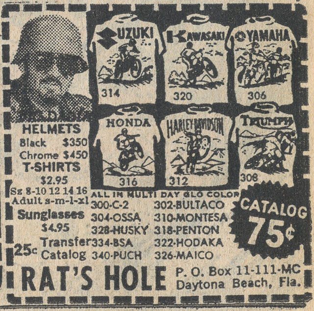 Looking at this ad, I wonder what sort of jagoff would blow that huge wad of dough particularly that amount in early 1970s dollars for a German stormtrooper helmet. It’s more sad than anything. Yes, you too can look like the third dress extra from the left behind Peter Fonda in The Wild Angels.