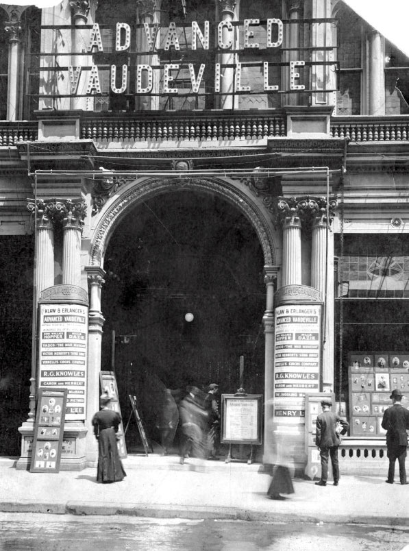 This photo was taken in 1940, shortly before the demolition of the theater. The sign you see in front is an advertisement for the wrecking company.