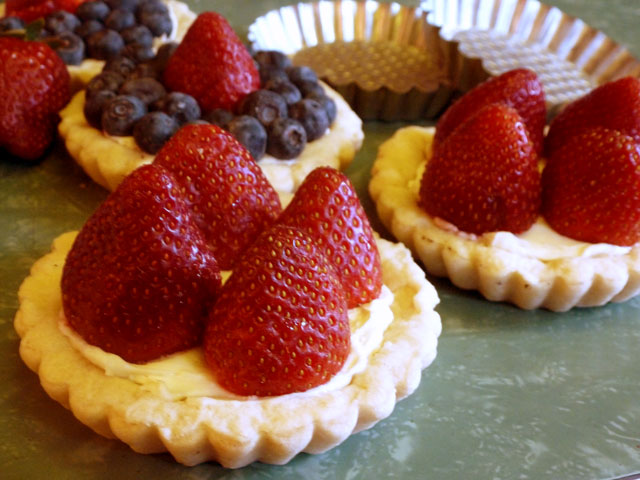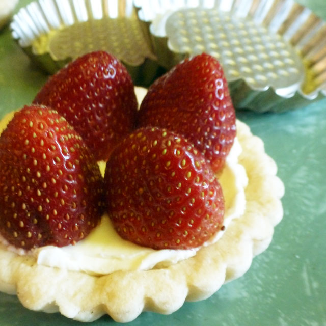 Top with fresh strawberries. You can use other fruits – blueberries, raspberries, bananas, mangoes – mix it up! Keep tarts refrigerated until serving time, and it’s best to add the fruit at the last minute. This makes eight 4 inch tarts.
