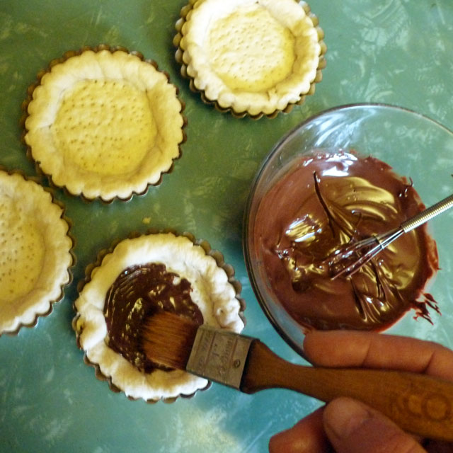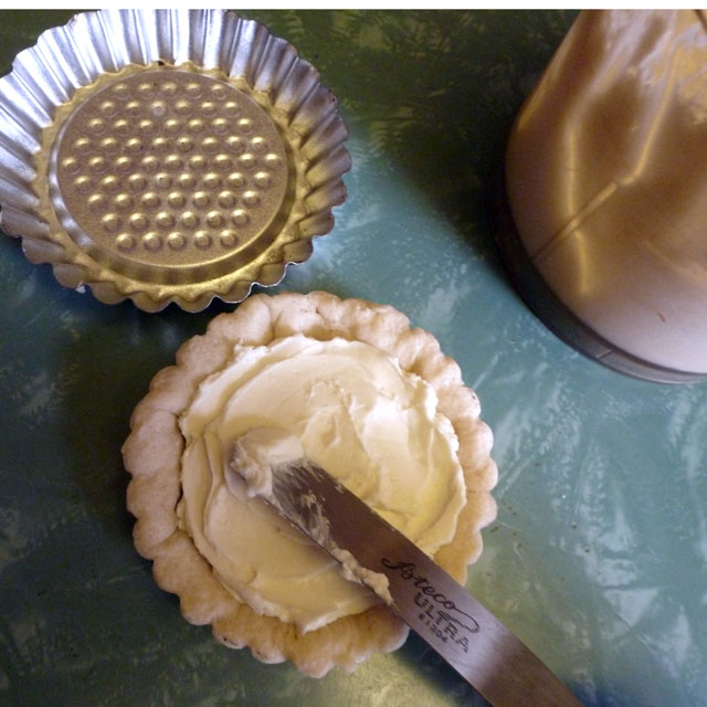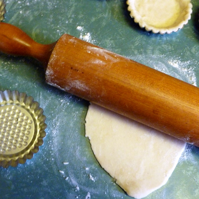 Cut the dough in eight pieces. Roll each piece on a lightly floured surface about 1/8 of an inch thick and place in tart pans. Prick the bottom of the dough with a fork, and bake in a 400º preheated oven for 15 minutes or until the shell is lightly browned. Let shells cool.
