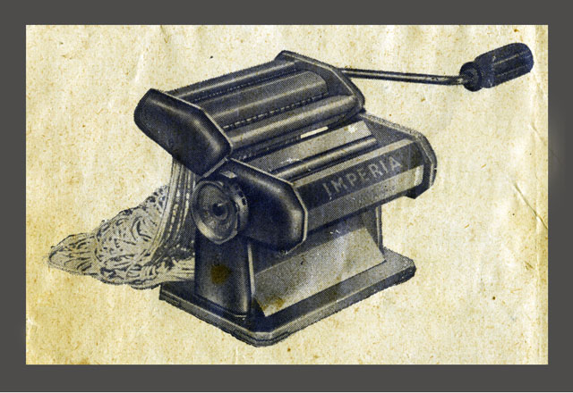 I inherited this pasta machine from a neighbor this week. Judging from the instructional booklet – I believe it dates back to the Truman administration. I always wanted a pasta machine, but a lack of storage space in my kitchen prevented me from purchasing one. So when this little gem dropped in my lap, I suddenly had dreams of hand cut fettuccine and glistening pans of meaty lasagna!
