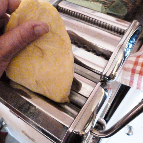 Cut the dough into 6 pieces and flatten into a rectangle. With the pasta machine set to the widest setting, pass the dough through, fold in half, and pass it through again.