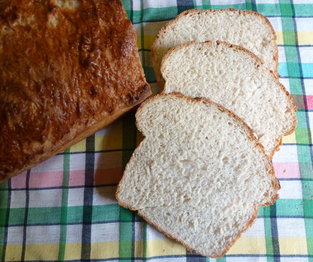 This is my go to recipe for buttermilk bread, it’s easy to make and uses regular, run of the mill, all purpose flour. It has a light texture and a wonderful tang to it. It’s a great bread for sandwiches, or you can eat it the way I do – warm from the oven, slathered in butter, standing over the sink!