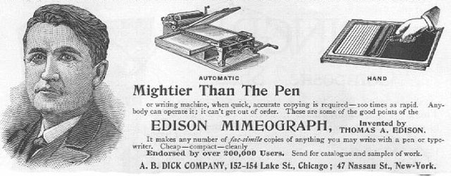There was also a mimeograph – invented by Thomas Edison, and sold by the A.B. Dick Company of Chicago in 1900. Here is the 1896 ad for the Edison Mimeograph.