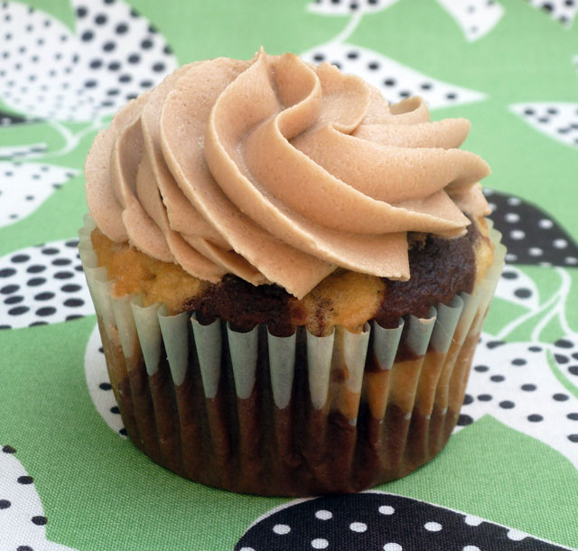 These beauties made an appearance at a cook out over the weekend. The advantage of making marble cupcakes is that you don’t need to make that tough choice between vanilla and chocolate. A scoop of vanilla batter, followed by a scoop of chocolate, a figure eight swirl with a butter knife and voila! What I want to talk about today, is the crowning glory of these cupcakes – a mocha buttercream frosting! I just love the combination of chocolate and coffee, it’s the perfect accompaniment to the marble cupcakes!