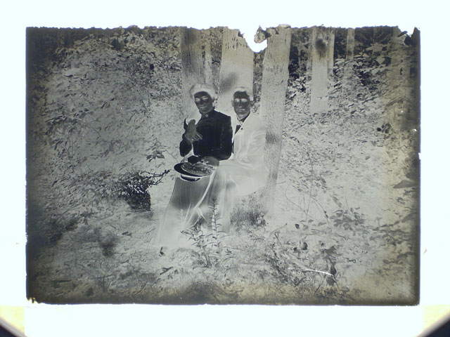 Here’s a picture of the photographer John Capewell of Westville, New Jersey sitting with his wife Ella in the shade of a tree. John and Ella look very young in this picture compared to others in the collection. I assumed it was a picture from when they were courting, and I was going to title this post Young Sweethearts, but I had a closer look at the negative.