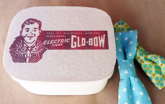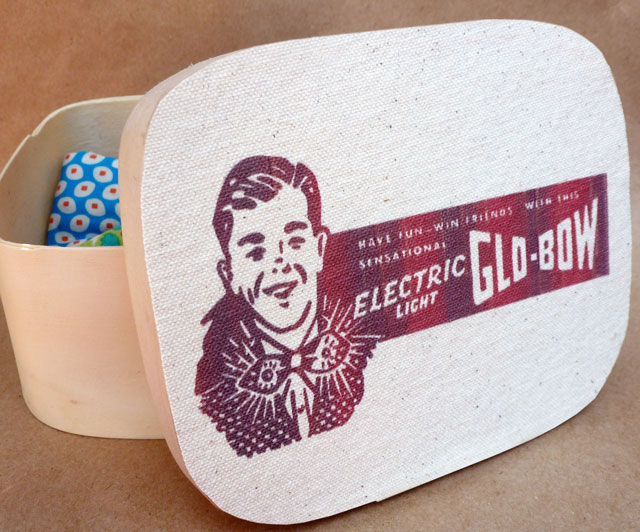 Printing with digital grounds on cotton worked out well, so I was curious as to how an image would print on a rougher surface like canvas. My son needed a box to store the half dozen bow ties I’ve made for him, so I went rooting around and found the perfect vintage ad for a bow tie that lit up – the Glo – Bow!