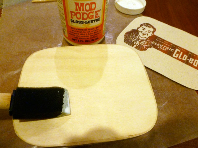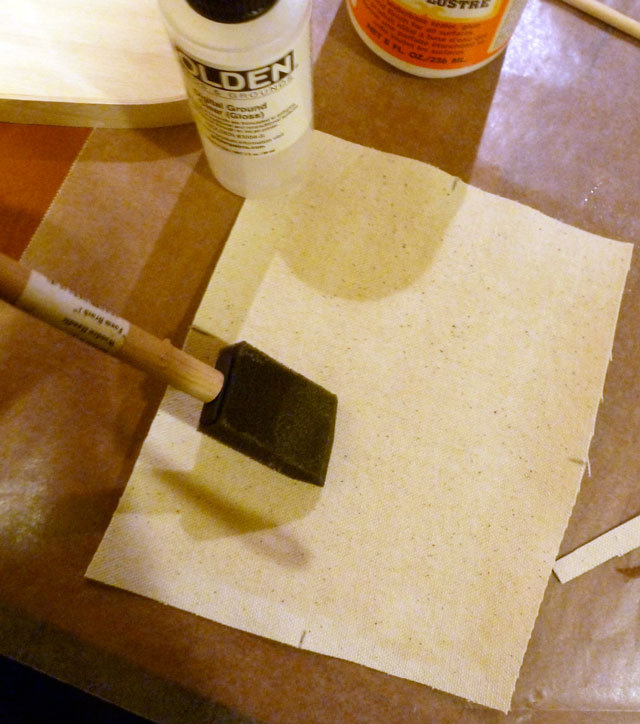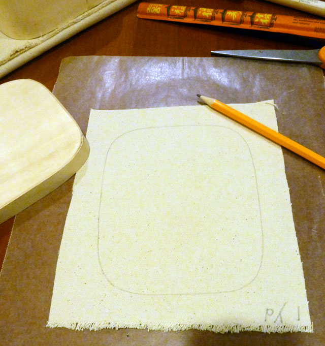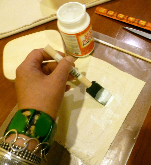 I wanted to glue the image to the box – the only problem is that the digital ground is water soluble – meaning that you can’t launder it or get it wet. I was afraid that the glue would saturate the ink and ruin the image, so I needed a work around. I decided that a coat of Mod Podge would act as a barrier, and prevent the canvas from fraying when I cut it out. I brushed a thin coat of Mod Podge on the side of the canvas where I traced the box lid.