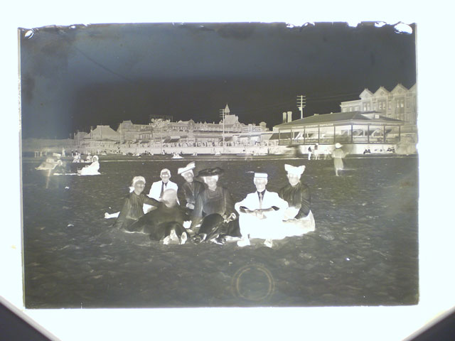 This week’s post from The Capewell Glass Negative Collection finds our photographer John Capewell of Westville, New Jersey seated on the beach of Atlantic City with some friends and/or family members some time very early in the Twentieth Century. Capewell is in the back to the left and next to him, slightly blurry, is his wife Ella.