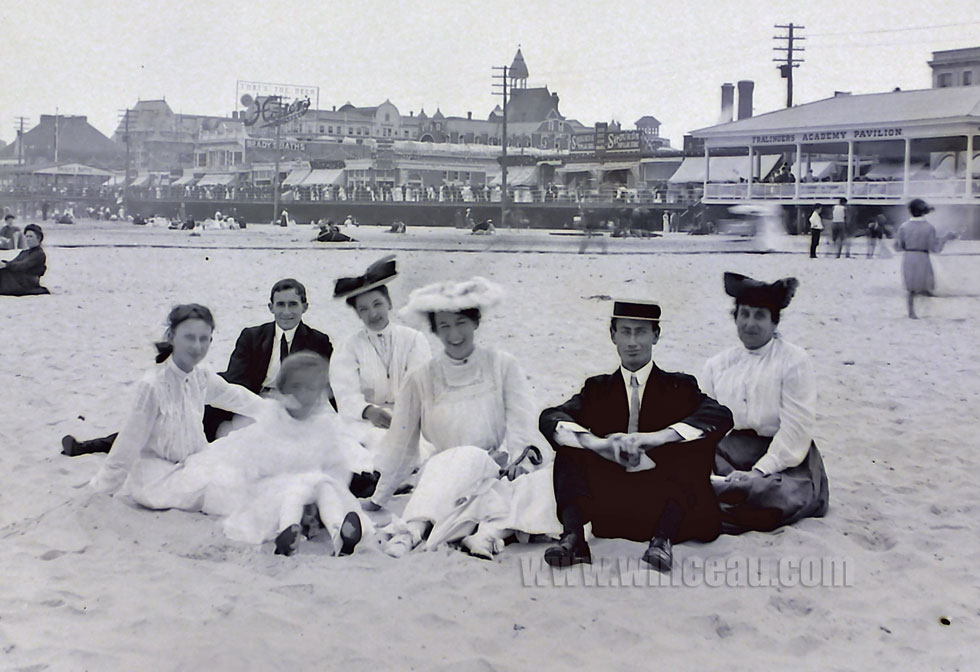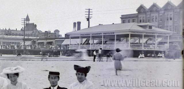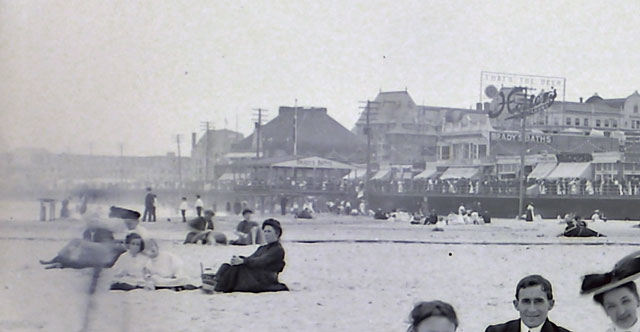 The smiling Capewell’s are in the lower right. Above John’s head and above the Brady’s Bath sign is a Holter’s beer ad with the tagline above the logo reading That’s The Beer. This was well before prohibition and the events that take place on the show Boardwalk Empire. Notice that the boardwalk is teeming with people.
