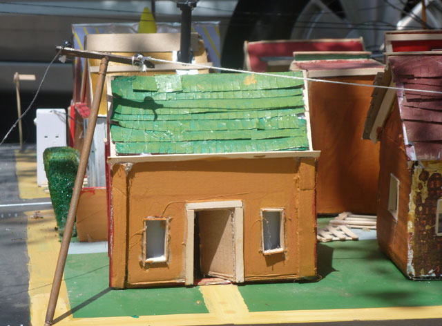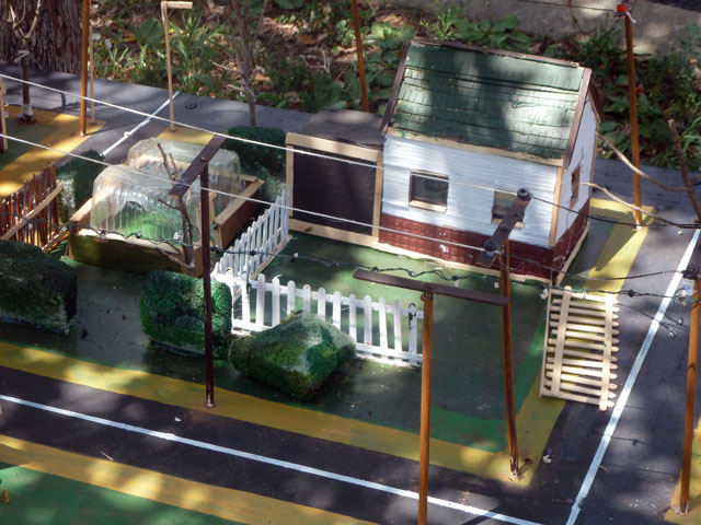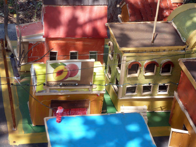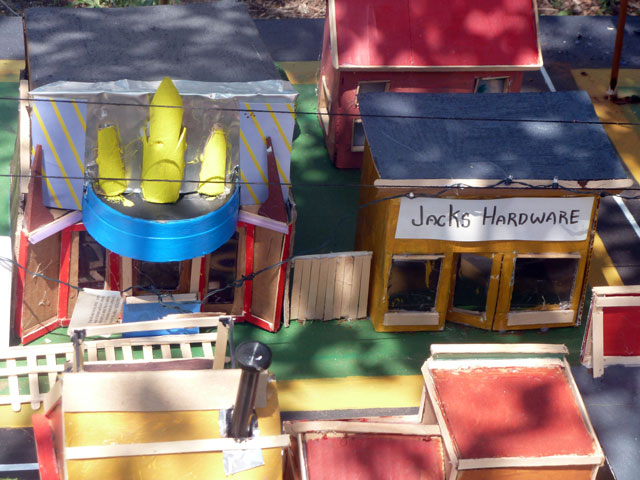 While walking up Carpenter Street in South Philadelphia, I spotted this tiny toy kingdom on the sidewalk. It was created by the kids of the Hawthorne Cultural Center day camp. It was made of popsicle sticks, cardboard and bits and pieces that would have ordinarily been destined for the recycling bin, the attention to detail was amazing, I pulled out my camera and took a few shots.