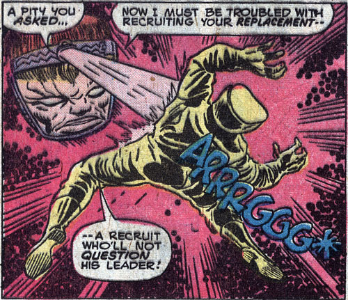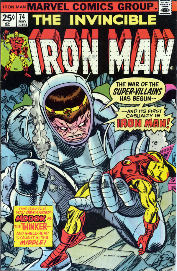The villain in this book was MODOK which stood for Mental Organism Designed Only for Killing, and he was literally the head of Advanced Idea Mechanics or A.I.M. which was a company similar to Stark Industries only bent on EVIL! Ordinarily MODOK is a cranky looking head with weird little baby arms and legs. Jack Kirby must have thought him up during a fevered dream. In this issue, MODOK fits himself with a robotic body so he could go toe-to-toe/blow-for-blow with the Golden Avenger. On this Gil Kane cover, it looks as if the villain has gotten the best of our hero.