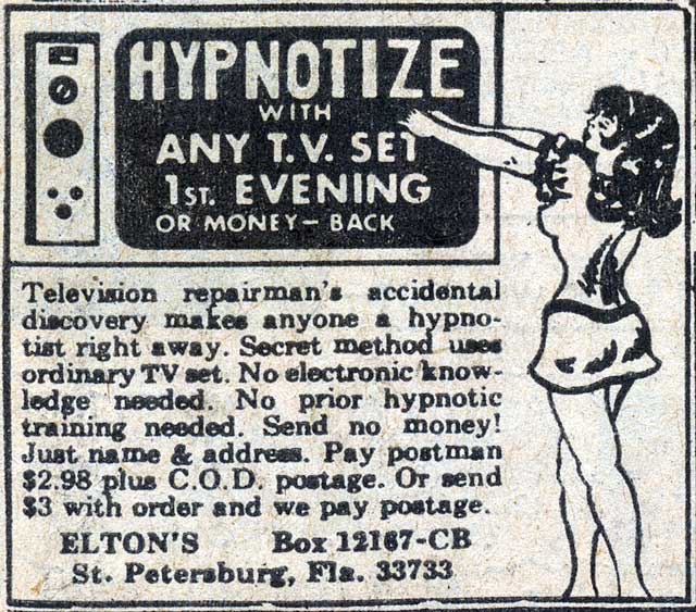…of course, somehow you would have to get the hottest girl in school to your basement turned rumpus room in order to pull the hypnotism via television caper on her. Maybe the instruction’s would have a helpful list of pretenses to get the girl over to your place.
