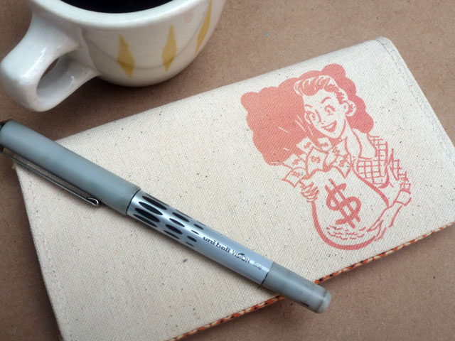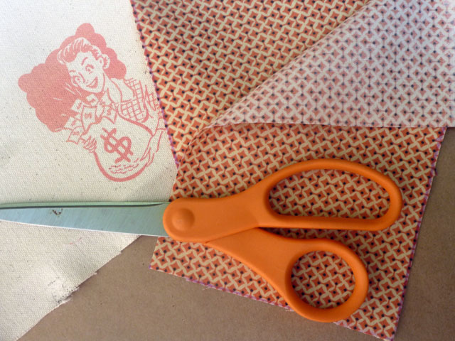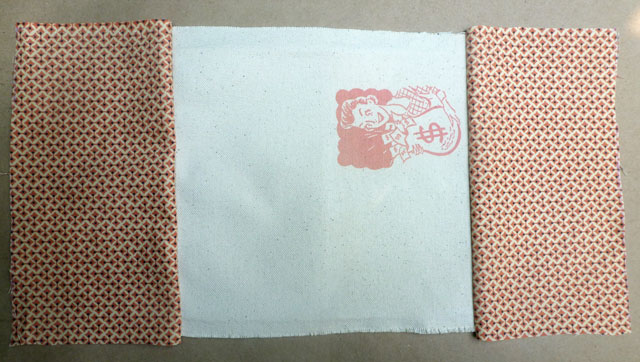 I used a scrap of canvas – 7 1/4″ x 7 1/2″, and two pieces of fabric – 7 1/4″ x 4″. I coated the canvas with digital grounds, and printed Ms. Moneybags on the cover. (The hows of printing with digital grounds are here.) Then I sewed the three pieces of fabric together, using 1/4″ seam allowance. Press seams with an iron.