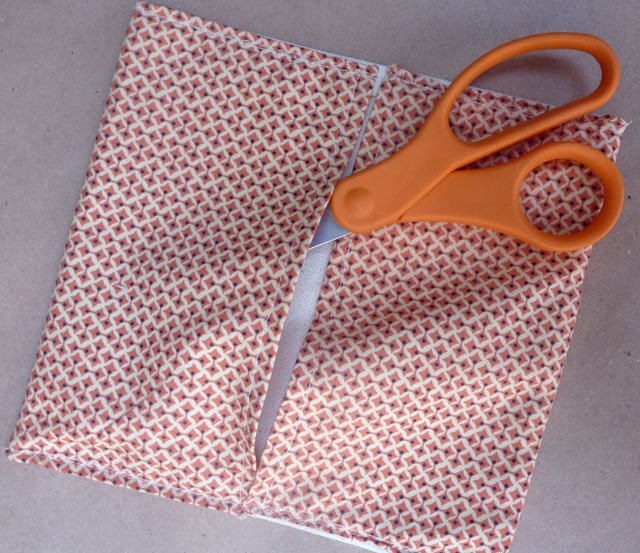 Fold patterned fabric to form the pockets, press with an iron, and pin into place. Stitch all the way down, 1/8″ from the sides.