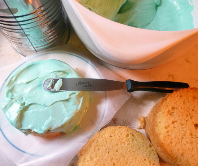 Wash out the cans, and coat the insides with cooking spray. Prepare a box cake mix, and divide it among the three cans – it’s about 1 1/2 cups of batter per can. Put the cans on a cookie sheet into a preheated 350º oven and bake for 30 to 35 minutes. I tested for doneness with a wooden skewer. Let cool, run a knife along the perimeter and remove cakes. Slice off the dome and cut them into one inch layers.
