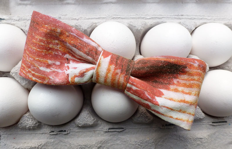 My experimentation with digital grounds continues! I thought it would be fun to make a bow tie out of fabric I created, specifically a bacon bow tie.