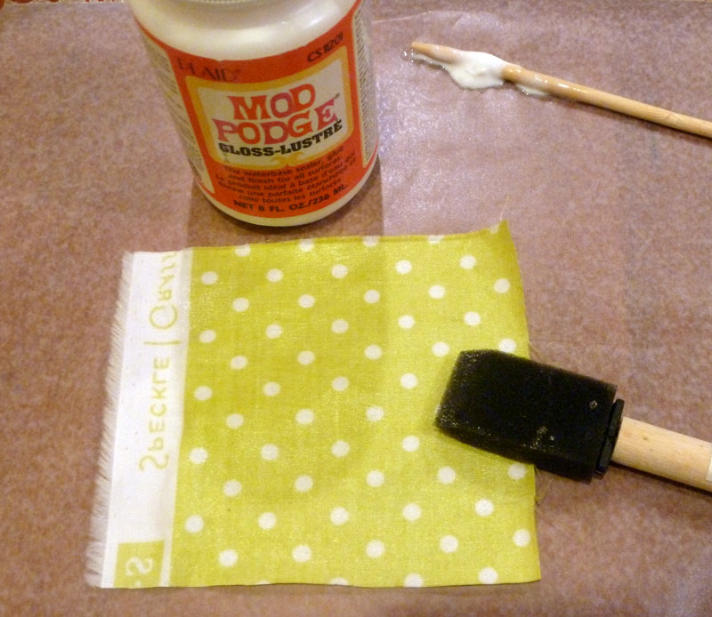 I cut out a piece of fabric and coated the back side with Mod Podge. This is to create a barrier for gluing the fabric down to the box, and so that the fabric wouldn’t fray when cut.