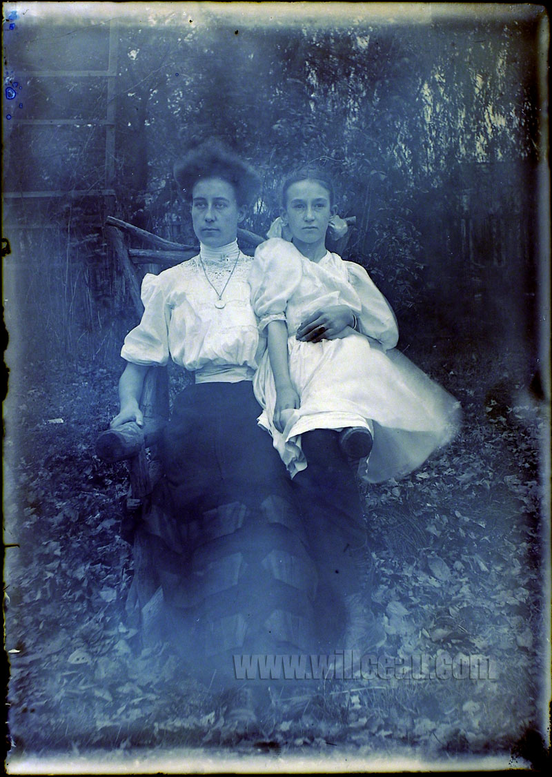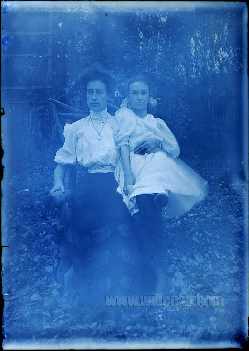 In this picture, the woman is either Margaret, Caroline or Frances. The girl is Edna Lavinia Capewell also known as Honey. They are seated in the lodgepole chair where John Capewell has shot many of his subjects. They are probably in a portion of John’s yard in Westville, New Jersey.